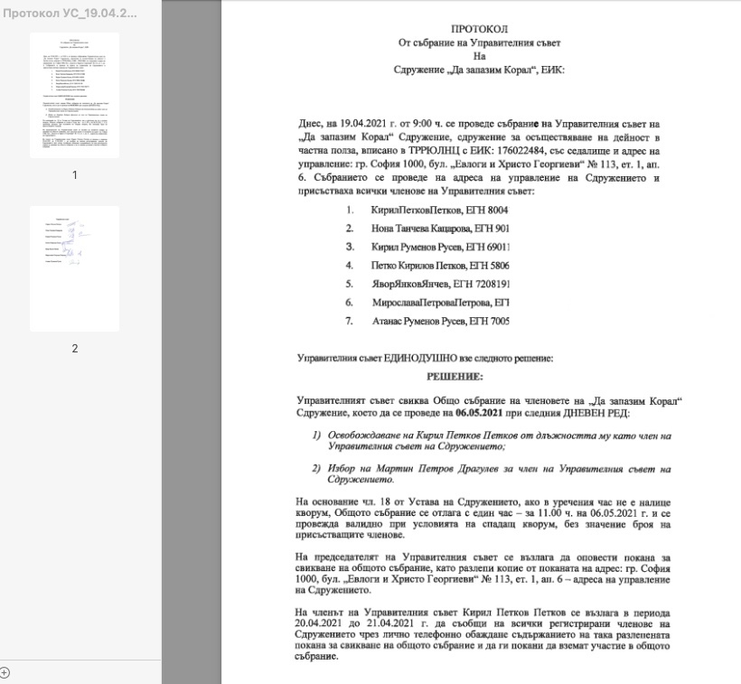 Протокол от заседание на УС и взето решение на него за смяната на Кирил Петков с Драгулев и свикване на Общо събрание. в документа фигурират имената на самия Кирил Петков и на баща му Петко, също член на Управителния съвет на Сдружение “Да запазим Корал”