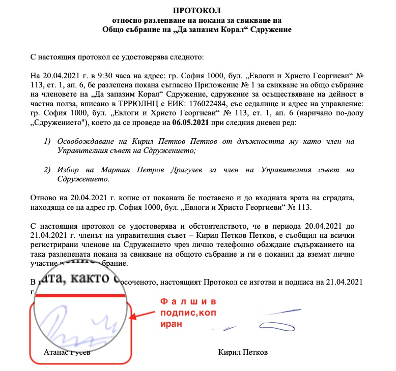 Протокол, относно разлепване на покана за свикване на Общо събрание на „Да запазим Корал“. Той е с дата 21.04.2021 г., подписан от Кирил Петков. Там стои ифалшифицираният подпис на Атанас Русев. (Копиран от спесимена на подпис на управителя на Сдружението). Документът е съставен на 13.05.2021 г, в 1:36 часа през нощта.