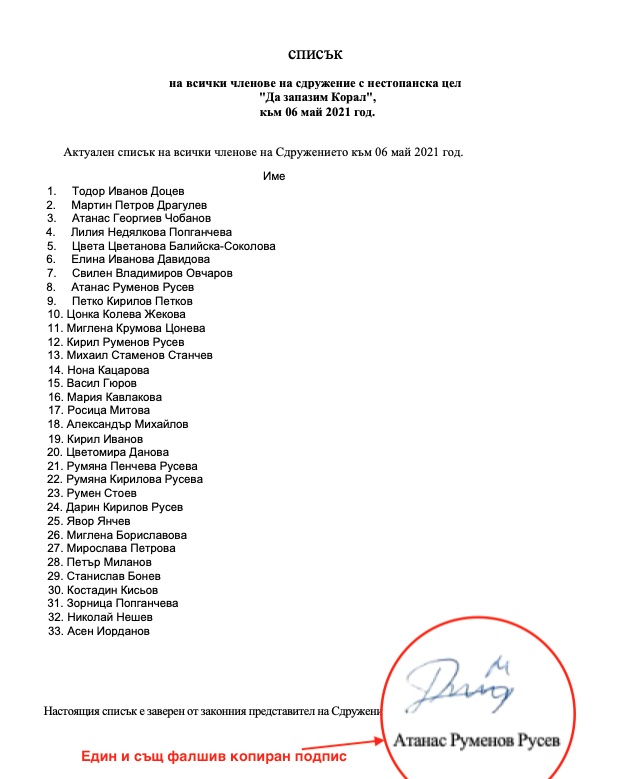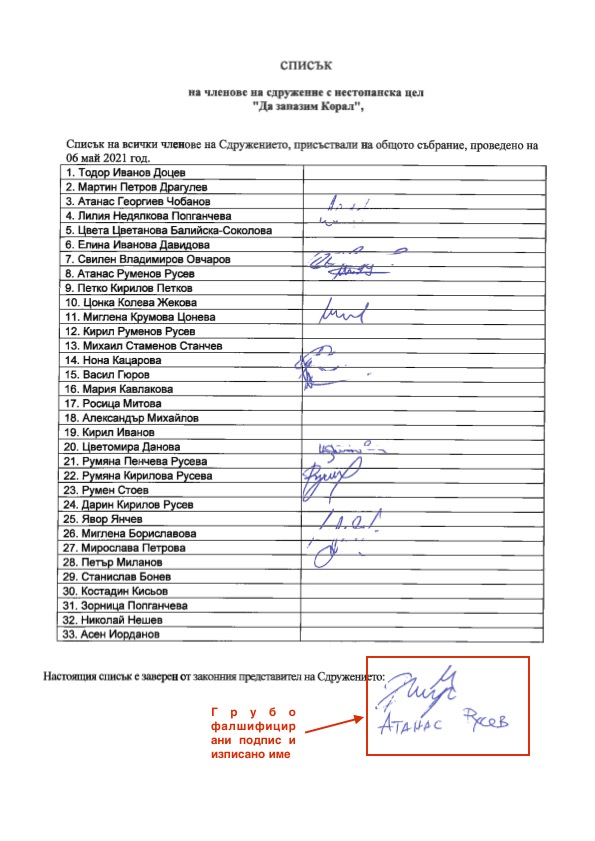 - Списък на всички членове на всички членове на сдружение с нестопанска цел”Да запазим Корал”, към 06 май 2021 год. Този документ е отново с копирания фалшив подпис на Председателя Русев. Съставен е в 1:43 мин.