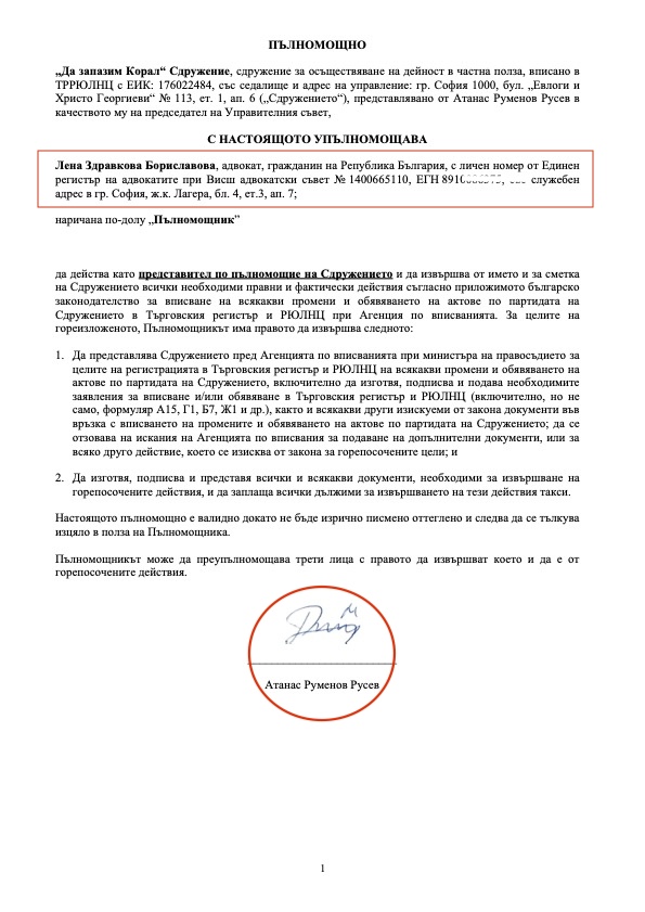 Кирил Петков е бил „освободен“ от длъжността си на управител в сдружението за защита на Корал, но с цената на фалшифицирано пълномощно, фалшиви документи, протоколи и подписи на другите членове от сдружението. Неистинските документи са били входирани в Агенцията по вписванията не от друг, а от персонално от адвокат Лена Бориславова, с нейния квалифициран електронен подпис (КЕП)!