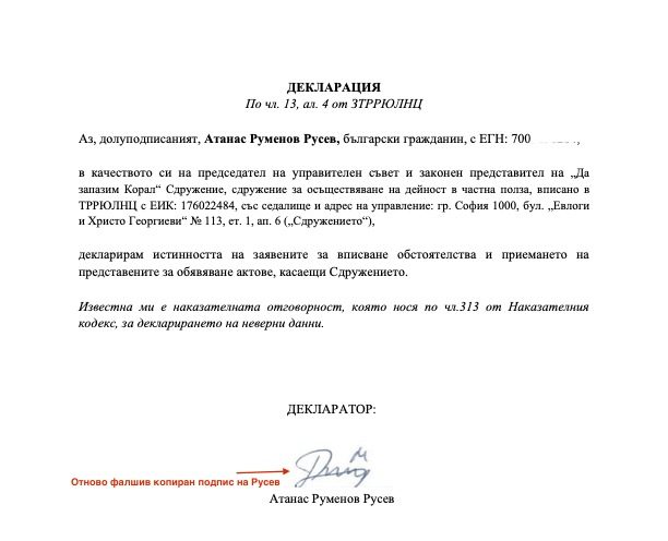- Декларация по чл. 13, ал. 4 от ЗТРРЮЛНЦза истинността на гореописаните документи от името на Атанас Русев. На нея също е поставен фалшифицирания подпис на Атанас Русев. Документът е с дата 13.05.2021 г. съставен в 1:41 часа през нощта. Две минути след съставянето на фалшивото пълномощно на Лена Бориславова. Фалшифицираният подпис на Атанас Русев е един и същ и в двата документа и си личи, че е сканиран, а не саморъчно положен. Дори си личи квадратчето, с което софтуерно е отрязан само подписът. Декларацията гласи: