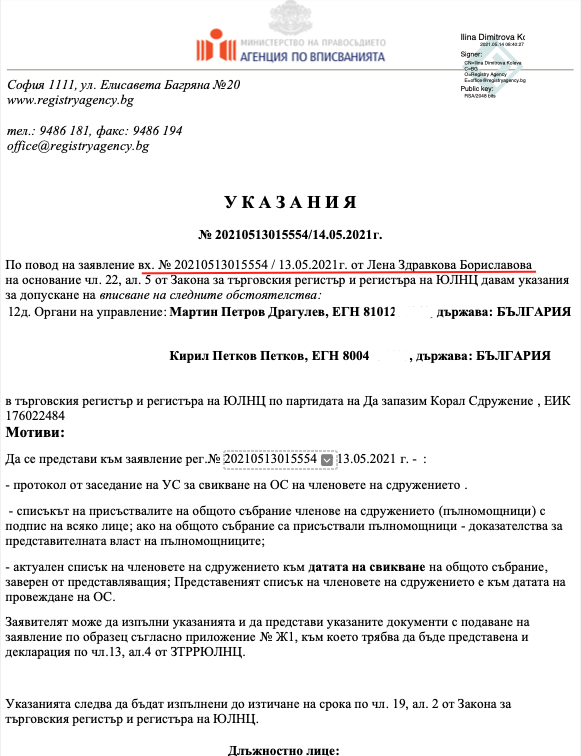 Още същия ден сутринта неистинските документи са били сканирани и внесени в Агенцията по вписванията с електронния подпис на адвокат Лена Бориславова. От там на следващия ден в 8:40 сутринта, връщат писмо с Указания по заявление вх. No 20210513015554/13.05.2021г. на адвокат Лена Здравкова Бориславова за допускане вписване промяната в органа на управление на Сдружение „Да запазим Корал“.