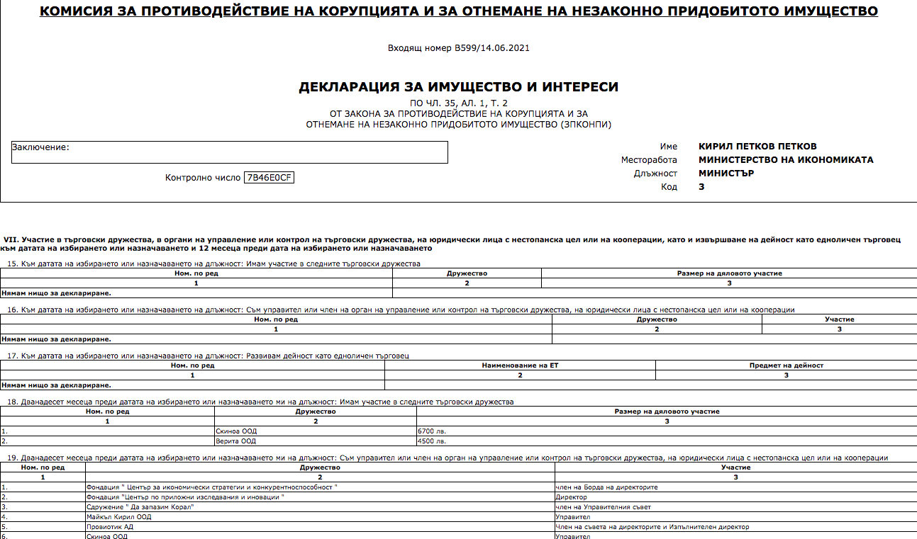 Очевидно резултатът е настъпил в нужния порядък, защото на 14.06.2021 г. Кирил Петков подава Декларация пред КПКОНПИ, според изискванията на Закона за администрацията и Закона за противодействие на корупцията. В декларацията си новоназначеният Министър на икономиката заявява официално, че към момента на встъпването си в длъжност на високия властови държавен пост не е бил член на управление или контрол на дружества, или юридически лица с нестопанска цел /каквото е случая със Сдружението за „Корал“/. Последното обстоятелство е практически въвеждане в заблуждение както на КПКОНПИ, така и на Министерски съвет, чийто член е Петков, тъй като той реално и според законите на Република България не е напускал или излизал легално от Управителния съвет на това дружество.