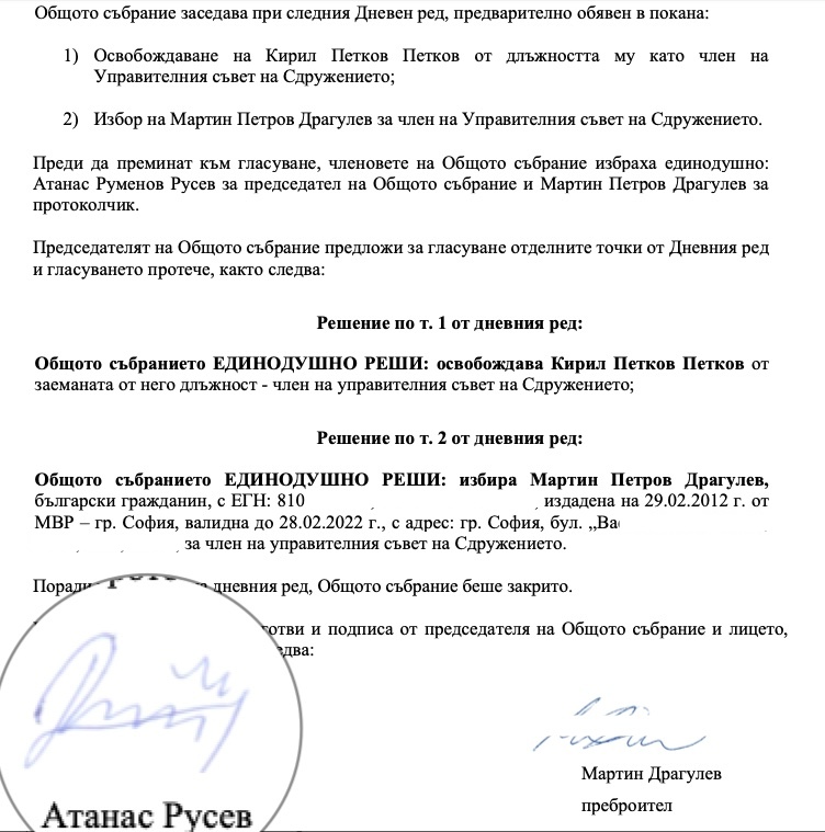 - Протокол от Общо събрание на Дружеството на 06 май 2021 г., с една единствена точка в дневния ред, освобождаването на Кирил Петков от Управителния съвет на Сдружението. На негово място в Управителния съвет влиза никому неизвестният в Сдружението Мартин Драгулев, който унаследява целия бизнес на Кирил Петков. Драгулев е или управител, или в борда на директорите във всичките фирми на Петков.Не е трудно да се предположи, че е особено доверено лице на бившия Премиер и Лидер на ПП. На Протокола от Общото събрание също е поставен фалшифицирания подпис на председателя Атанас Русев. Тук подписа е изкопиран от старо пълномощно, издадено през 2019 г. Документът е подписан и от самият Мартин Драгулев, неизвестно защо и как. Протоколът е съставен на 13.05.2021 г. в 1:16 часа през нощта и завършен в 1.43 мин.