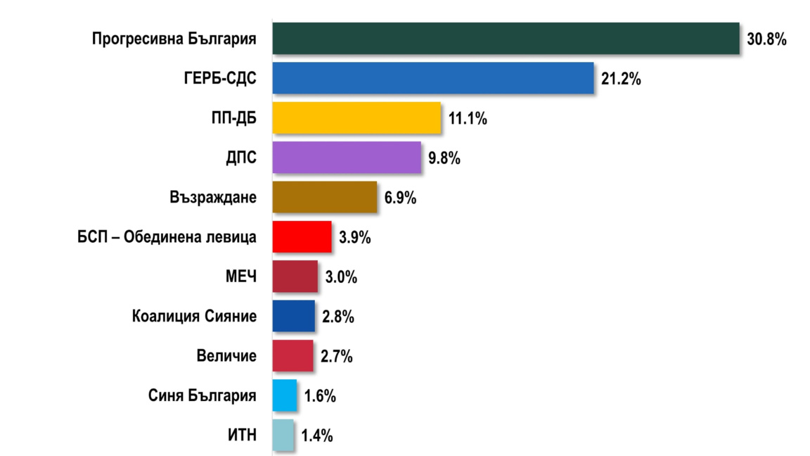 За момента под чертата остават: "БСП-Обединена левица" – 3,9%, МЕЧ с 3 на сто, Коалиция "Сияние" – 2,8% подкрепа, Величие с 2,7%, Синя България с 1,6 на сто, ИТН – 1,4%, АПС – 1,2 на сто. Други партии и коалиции събират подкрепата на 3,6% от българите.